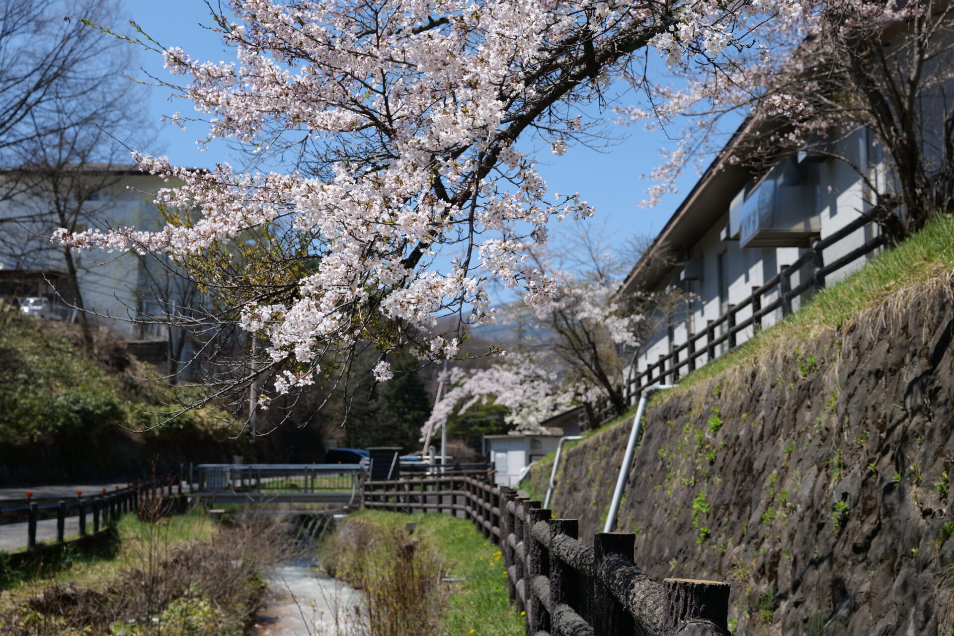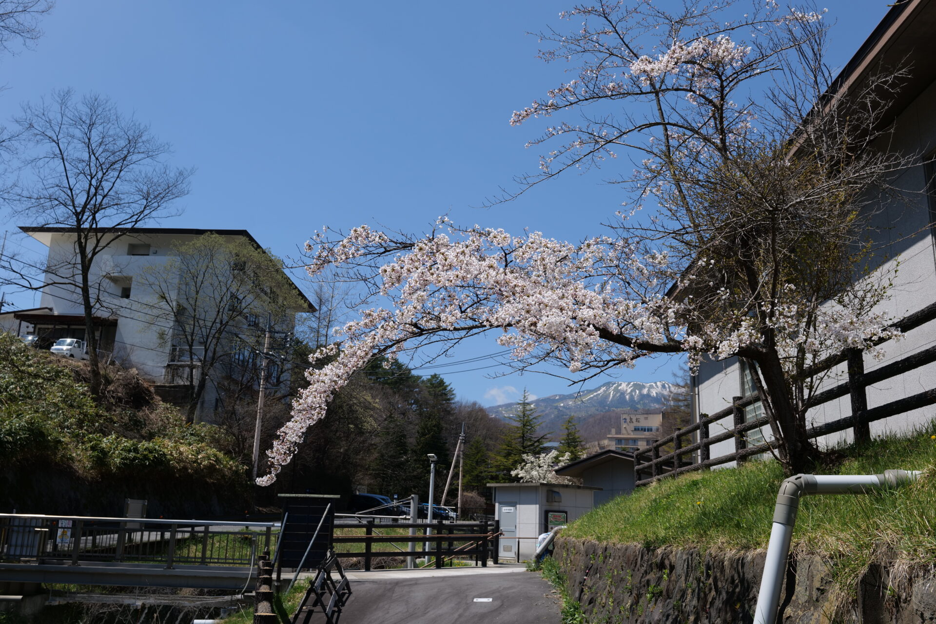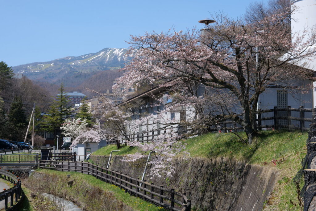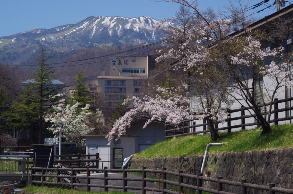 この組み合わせは、高原の温泉地ならではの春の風景です。