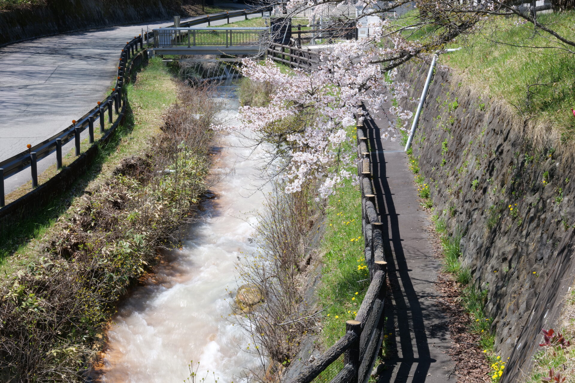 今回撮影したのは、品木ダム水質管理所の近くを流れる「湯川」沿いの桜です。