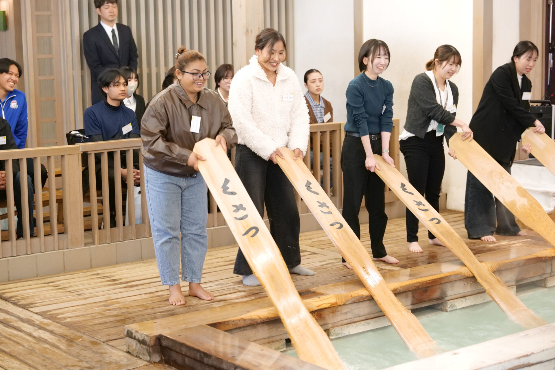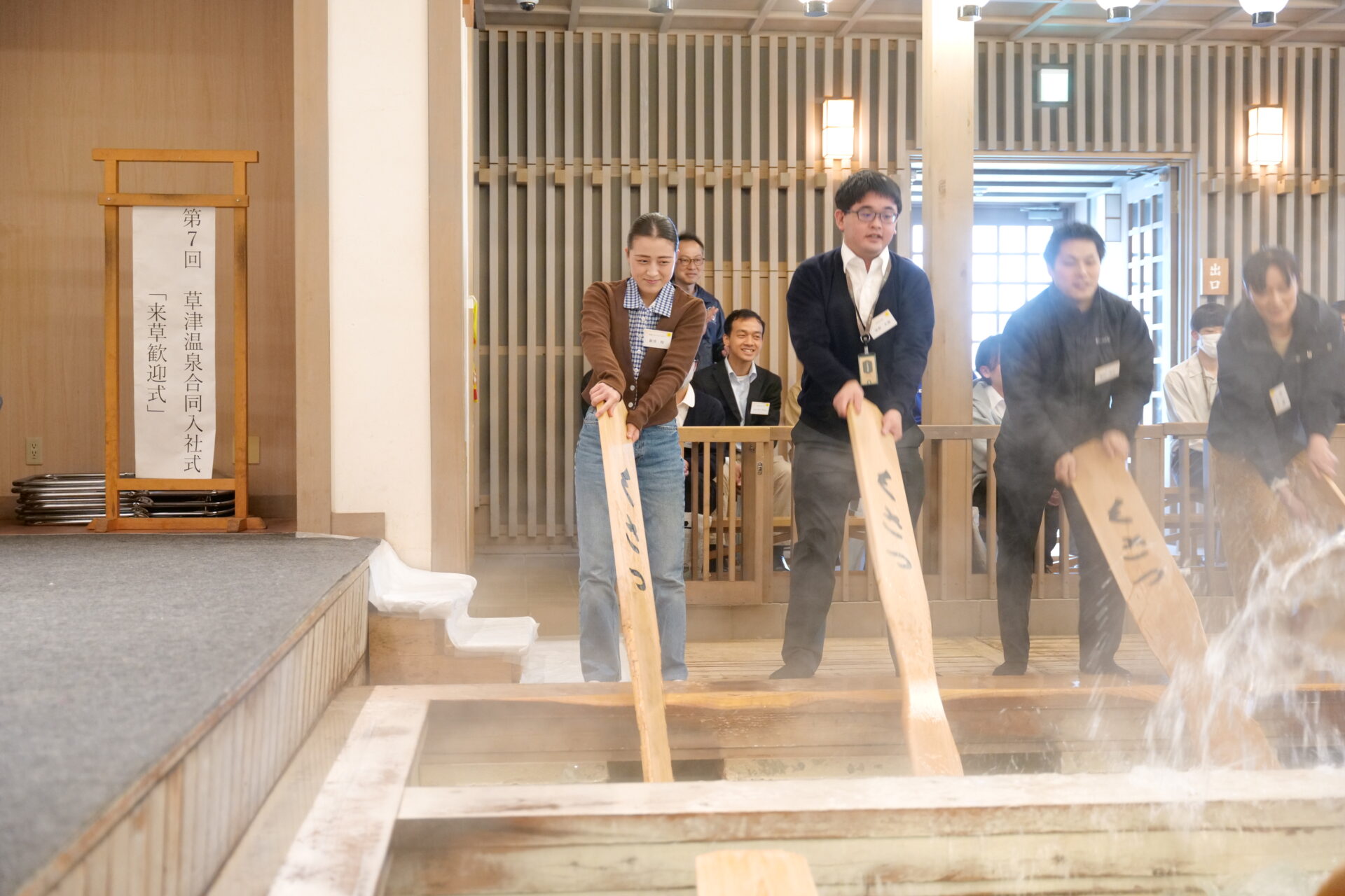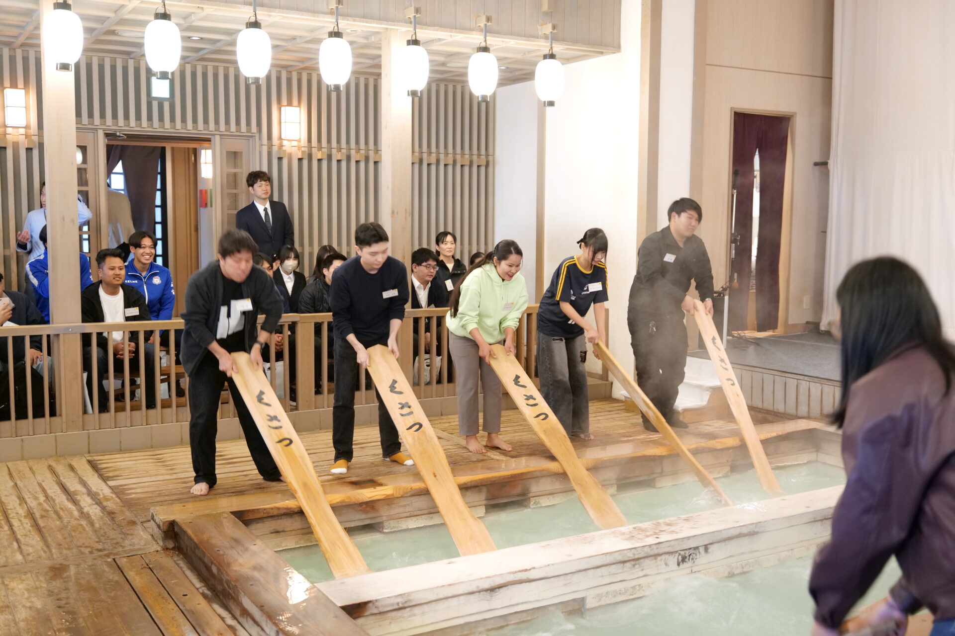 入社式の後には、草津温泉の伝統文化でもある「湯もみ体験」が行われました。
