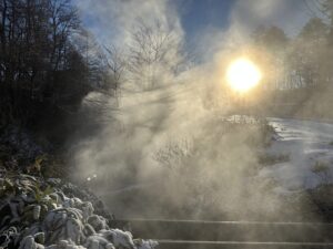冬の朝だけに現れる、湯川の霧氷と湯けむりの絶景