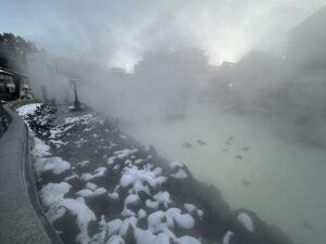 年始の静けさに包まれる朝の湯畑|2026年1月4日 早朝の幻想風景