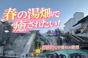 春の夕暮れ、幻想的に輝く湯畑の風景